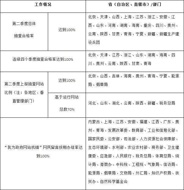 第二季度,国办信息公开办随机人工抽查各地区和国务院部门政府网站441个,总体合格率96%。其中,北京等22个地区政府网站抽查合格率为100%;北京、天津、江苏、浙江、山东、湖南、海南、四川、贵州、云南、陕西、甘肃、青海连续四个季度抽查合格率达100%。各地区、各部门共抽查本地区、本部门政府网站12286个,占运行政府网站总数的55%,总体合格率97%。经抽样复核,地区和部门抽查情况整体真实准确,抽查情况和问题网站名单已在中国政府网公开。