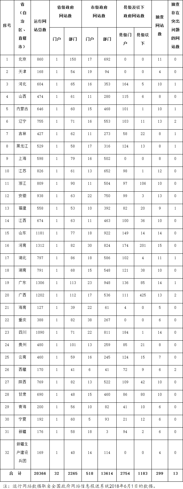 截至2018年6月1日,全国正在运行的政府网站22206家(含中国政府网)。其中,国务院部门及其内设、垂直管理机构政府网站1839家,省级政府门户网站32家,省级政府部门网站2265家,市级政府门户网站518家,市级政府部门网站13614家,县级政府门户网站2754家,县级以下政府网站1183家。