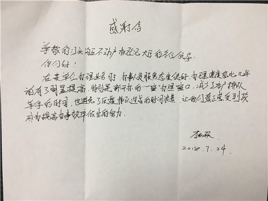 7月24日,门头沟区不动产登记事务中心收到市民李某的感谢信,信中对中心工作人员耐心细致的服务、便捷高效的办事效率表示肯定和感谢,特别是对优化营商环境,推进“互联网+不动产登记”改革实施工作的一窗受理窗口开办表示高度认可。全中心工作人员以此为鼓励,将继续秉持为民办实事的工作作风,不断提升自身素质,合力营造更加便利贴心的优质服务环境。