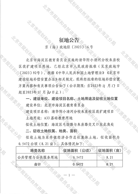征地公告 京-(海)政地征〔2023〕16号-清华附小清河分校朱房校区改扩建项目