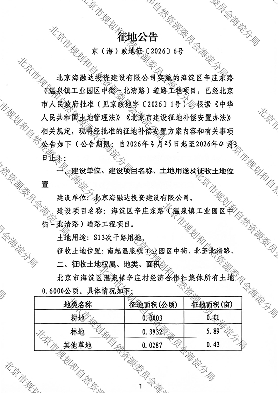 征地公告-京(海)政地征〔2026〕6号-海淀区辛庄东路(温泉镇工业园区中街~北清路)道路工程项目