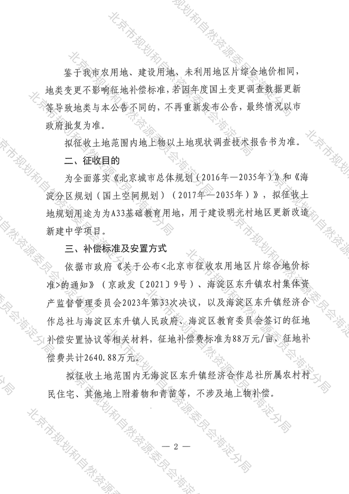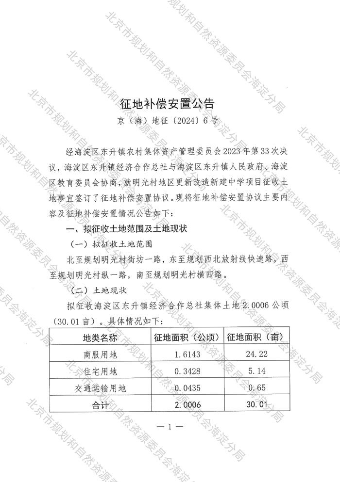 征地补偿安置公告 京(海)地征〔2024〕6号-明光村地区更新改造新建中学项目